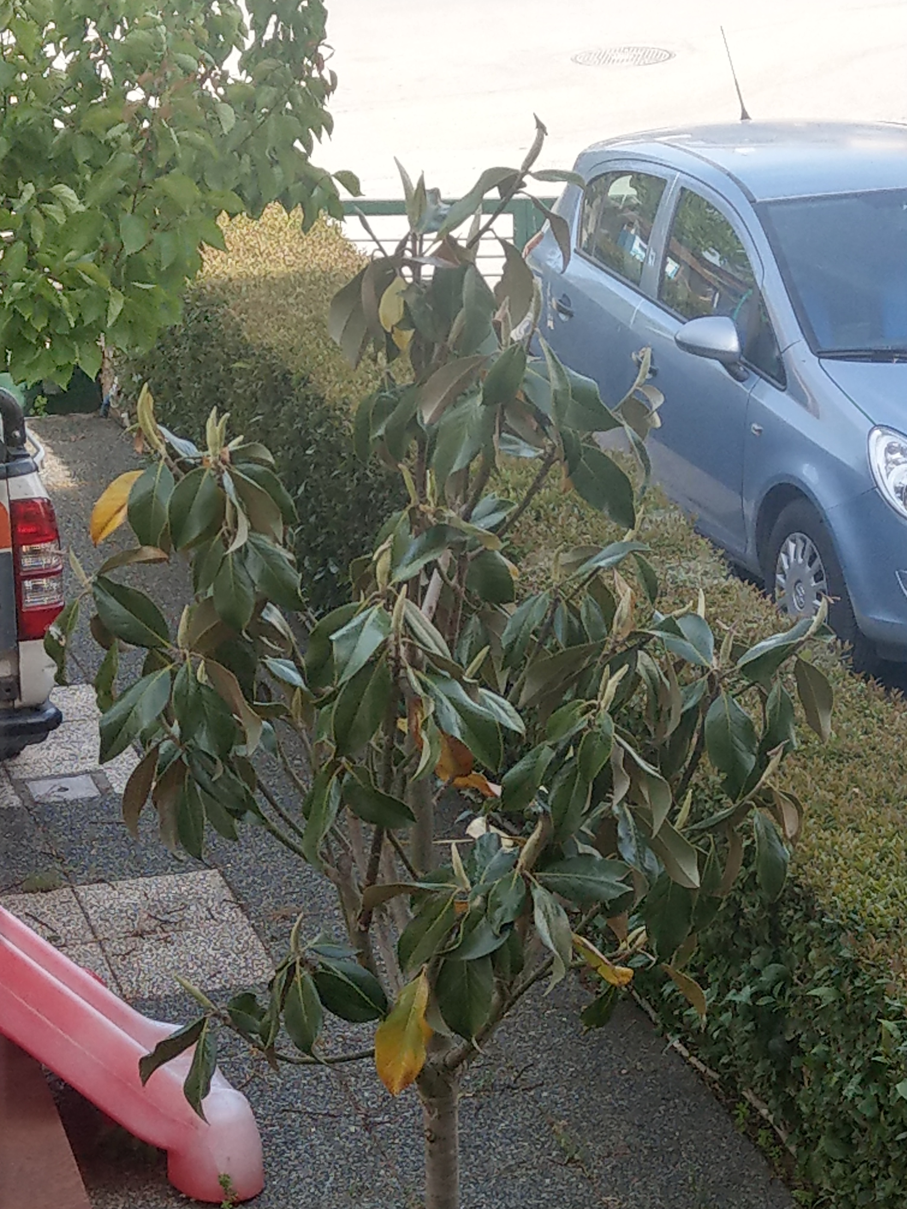 Θα ήθελα να προσθέσω ότι δε φαίνεται ένα ευχαριστημένο δέντρο.Είναι ανάμεσα στις πλάκες τσιμέντου,δε ξέρω κατα πόσο είναι προφυλαγμένο από αέρηδες το μέρος, αν είναι στραγγερό το έδαφος.Δεν εφησυχάζουμε λιπαίνουμε κάθε 10 -15 ημέρες άνοιξη ,φθινόπωρο,επίσης ποτίζουμε με θειικό σίδηρο.